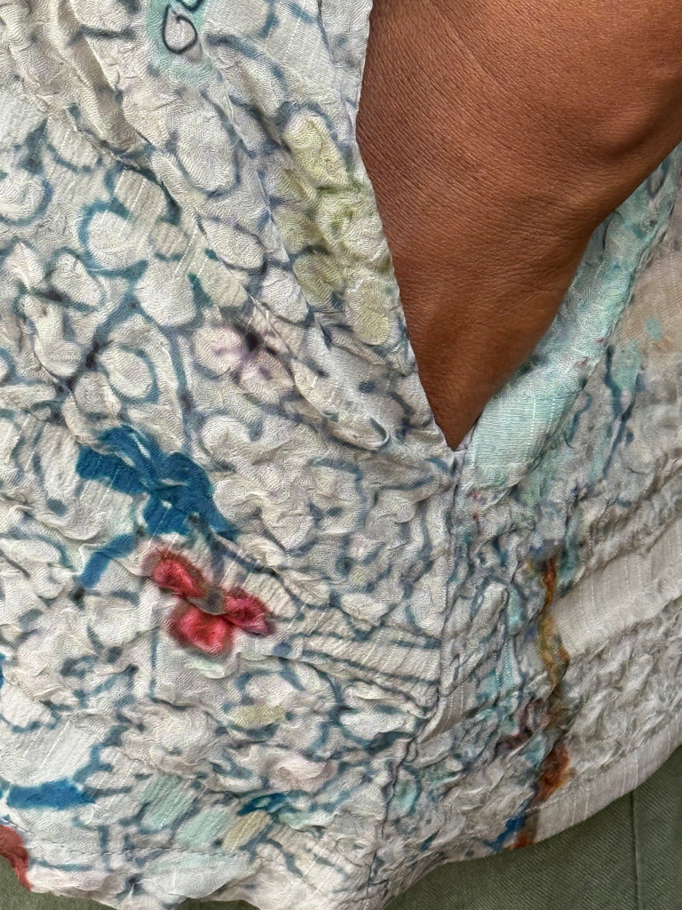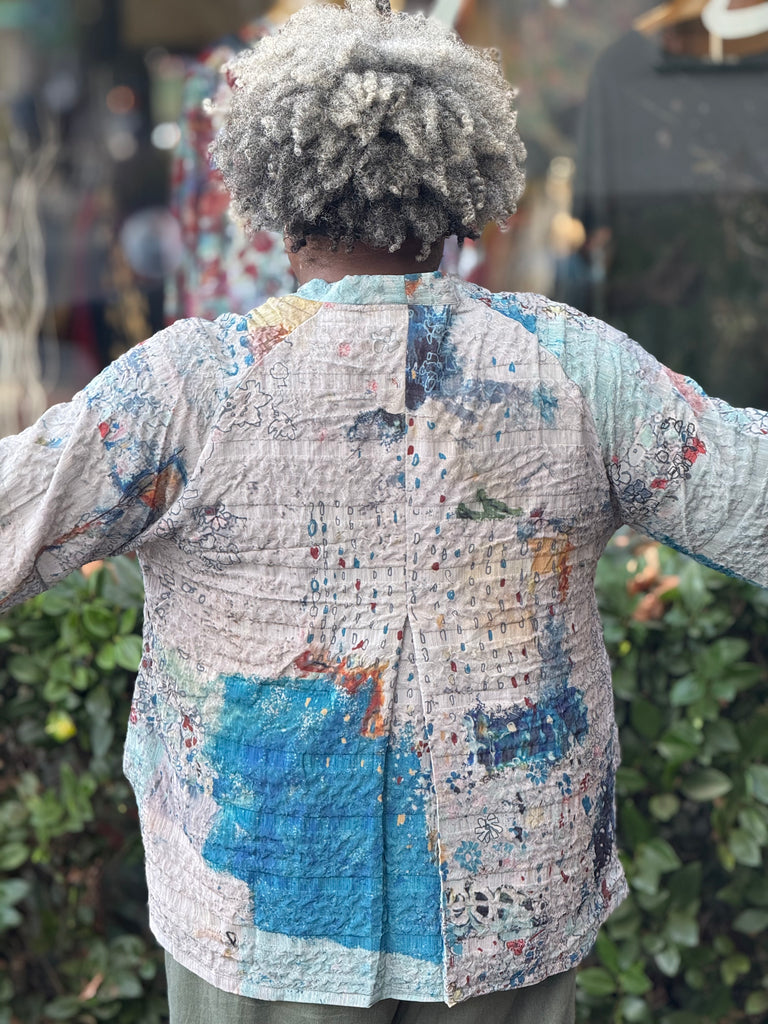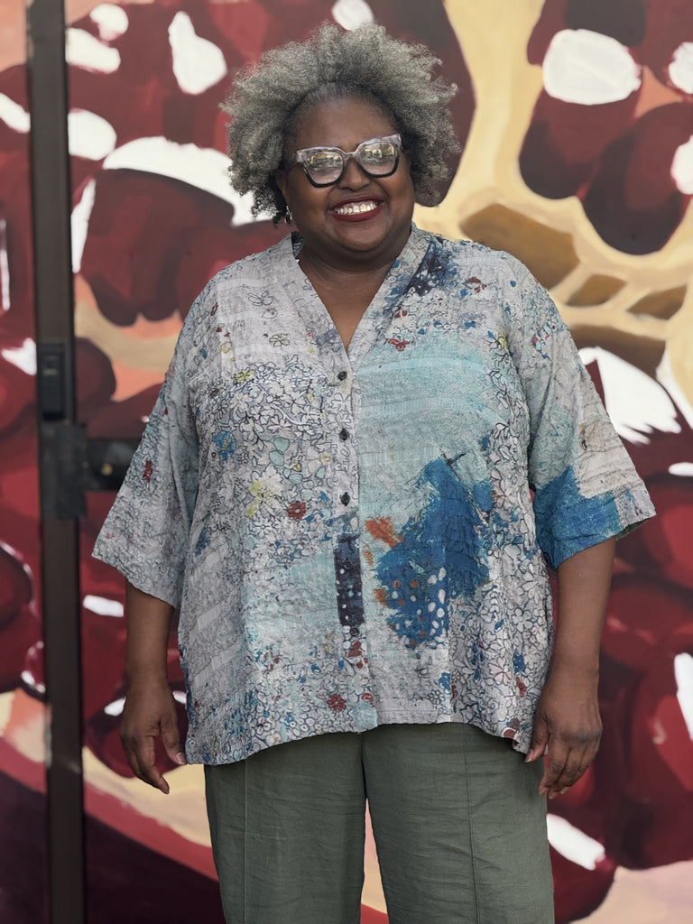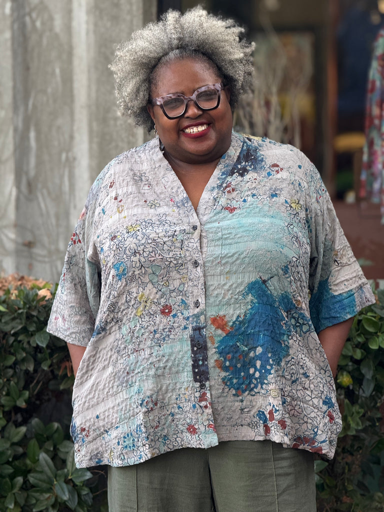 3 Potato is locally designed by Guo Feng, a clothing designer based in California who creates unique, artistic prints on easy-to-wear silhouettes. 3 Potato offers loose and flowy pieces that are both forgiving and flattering, combining artistic designs with effortless styleButton-front collared jacket/blouse