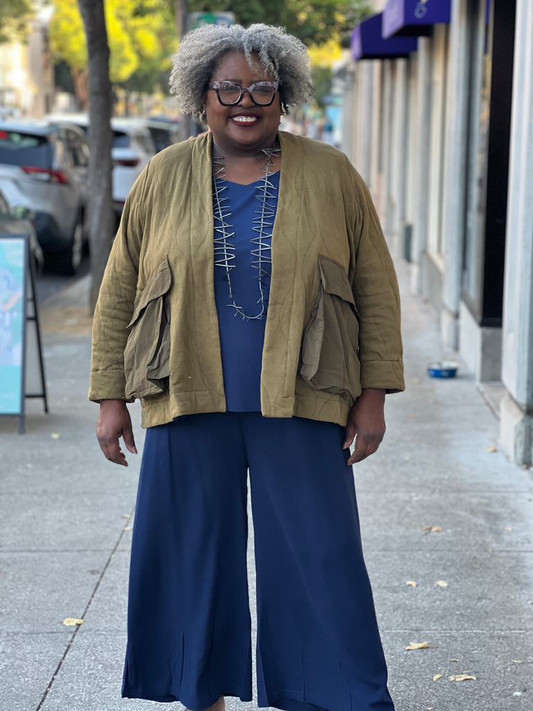 This oversized jacket brings a sculptural touch to everyday layering. Quilted for softness and structure, the cotton-blend fabric is enhanced with taffeta accents for subtle sheen. With a swingy A-line shape, wide lapels, and deep patch pockets, it blends cozy warmth with elevated style. Ideal for transitional weather and statement layering.