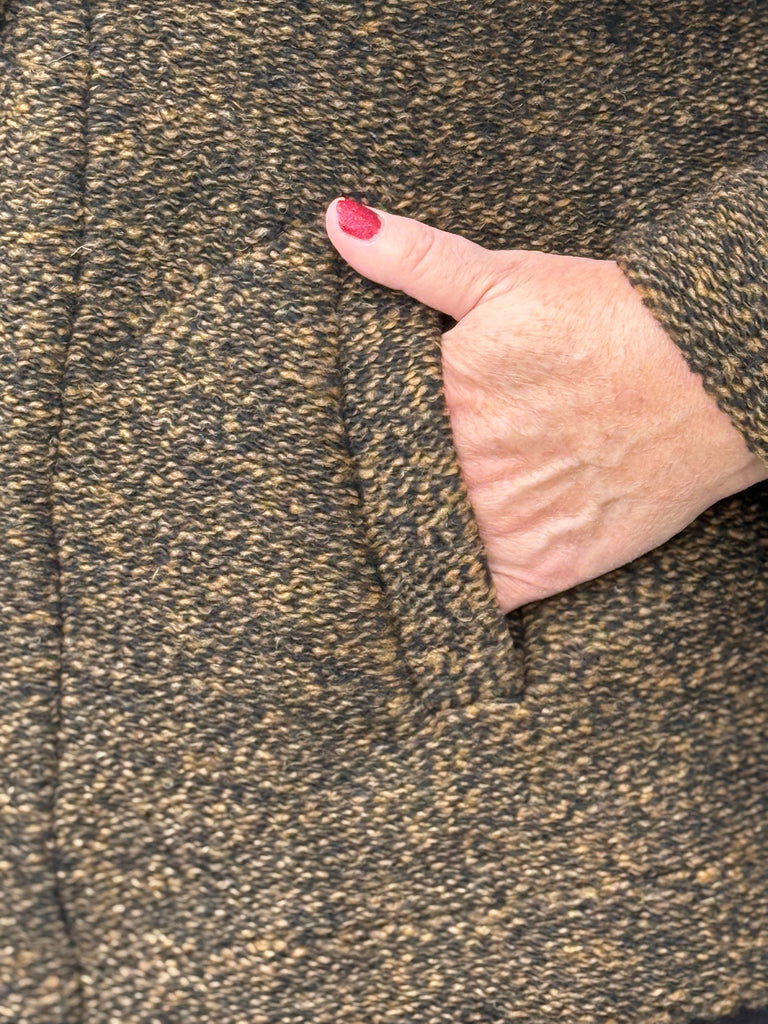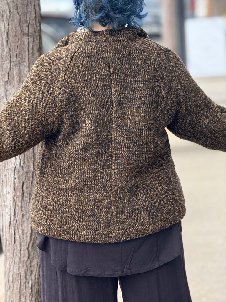 Effortlessly modern, this cropped jacket combines soft structure with smart design. The brushed knit fabric lends cozy texture, while a boxy A-line shape and raglan sleeves enhance its relaxed appeal. Oversized lapels and a single button closure elevate the finish. Layer it over dresses, knits, or trousers for an easy-chic statement.
