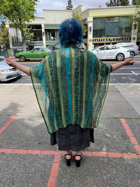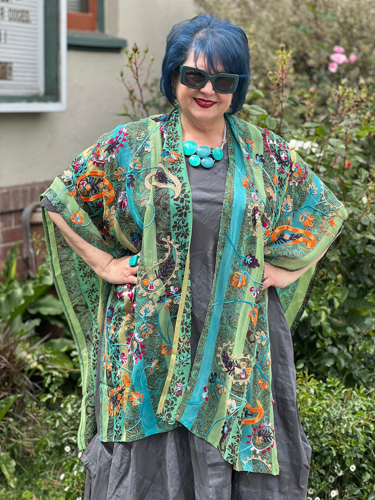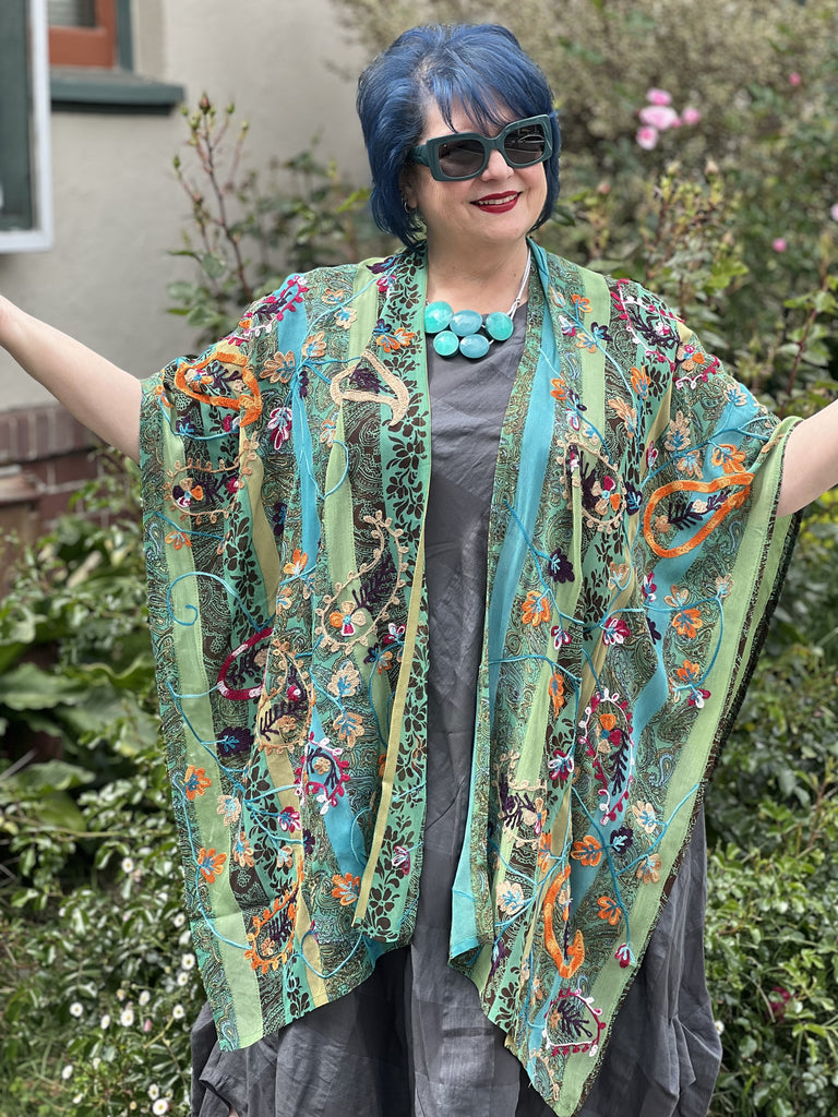 Dreamy shades of greens, blues and gorgeous embroidery make this lightweight topper a fabulous layering piece. It slips over the shoulders with an open front and sides, while keeping you covered in back. Darling over a tank and jeans or even as a swimsuit cover-up.