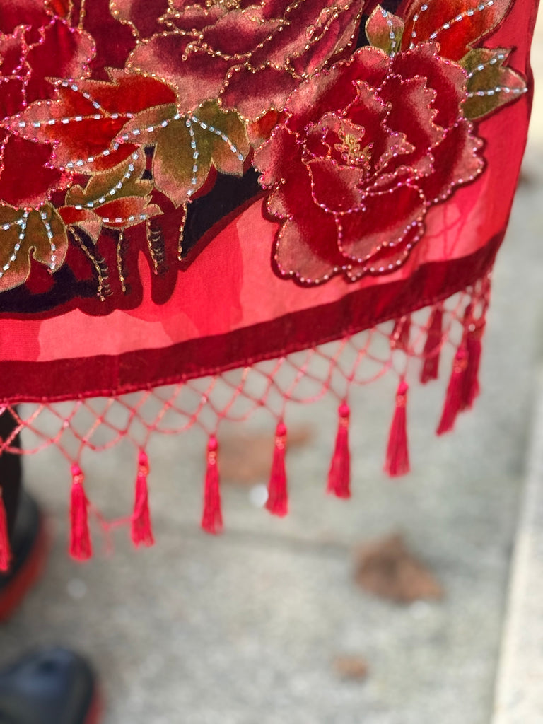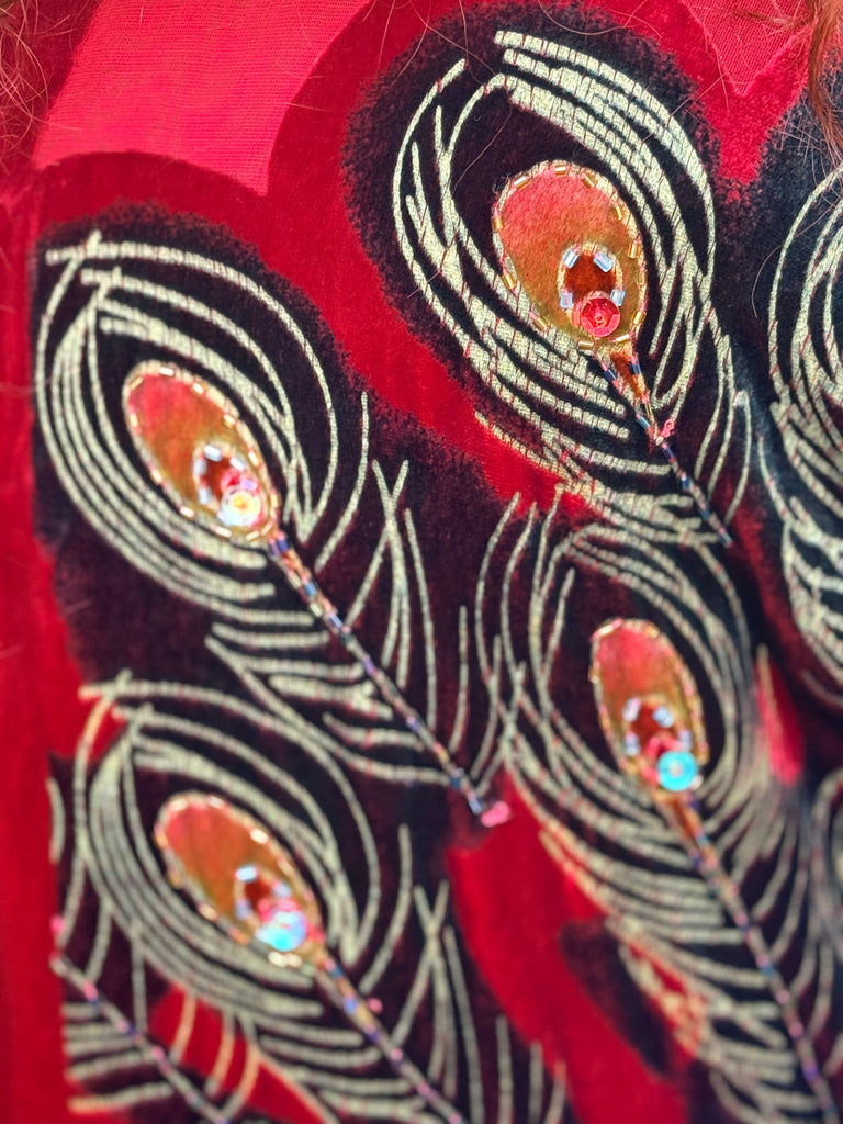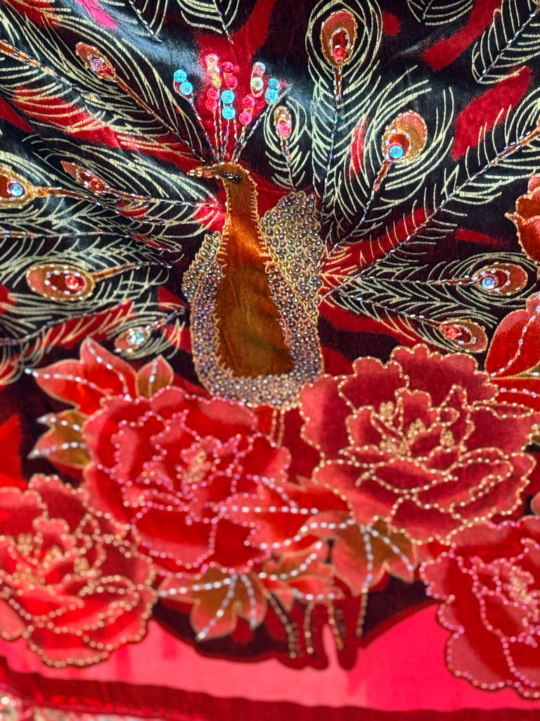 The Peacock Velvet Burnout Duster is a luxurious accessory crafted from silk and rayon velvet, featuring a stunning peacock pattern. With intricate beading and an open front design, this long duster adds a touch of elegance to any outfit. The unique burnout effect enhances its sophisticated appeal, making it perfect for both casual and formal occasions. Hand wash to maintain its delicate texture.