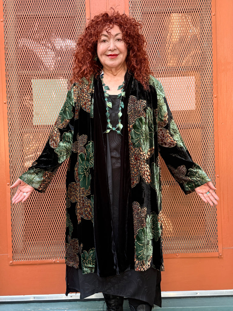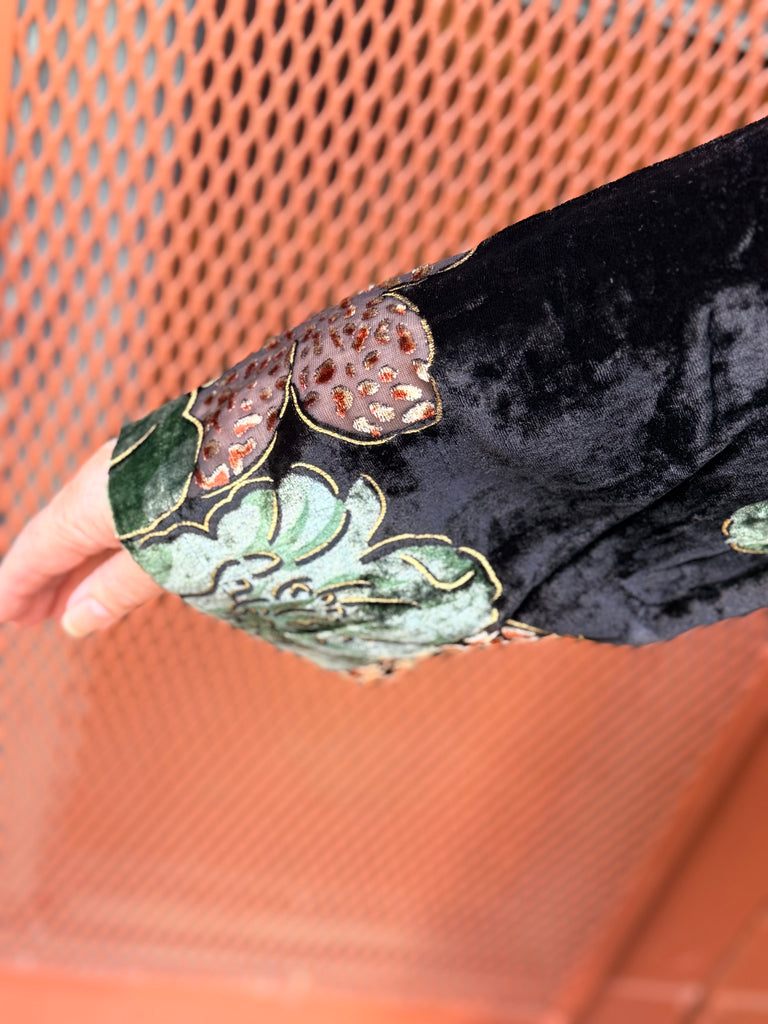 The Velvet Burnout Duster in Leaf is a luxurious short jacket made from a soft velvet blend of 70% rayon and 30% nylon. Featuring a subtle burnout pattern, it offers full-length sleeves and an open front for a refined, feminine look. This blouse is designed for comfort and elegance, suitable for both casual and dressy occasions.