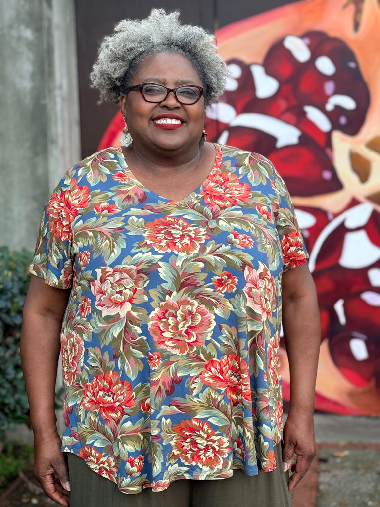 The Jackie has a forgiving fit, with short sleeves, and a design that allows the fabric to flow away from the body. A longer hem in the back provides coverage. The Bamboo jersey fabric makes the Jackie breathable and thin enough for layering.