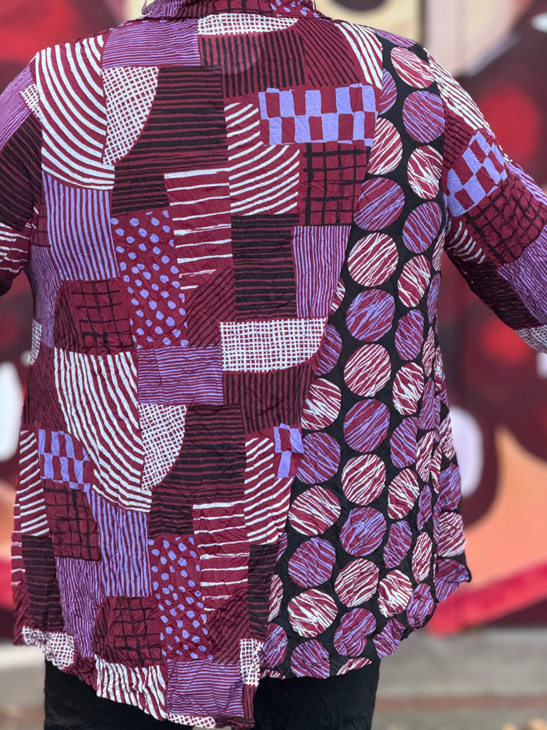 A bit slouchy, a bit trim and tailored, the crinkle mesh Petra Shirt is lightweight and lovely. With patterns that veer every which way, it buttons in front with a slouchy collared neckline, long sleeves and layered front pockets. The asymmetric hemline is shortest in the center front.