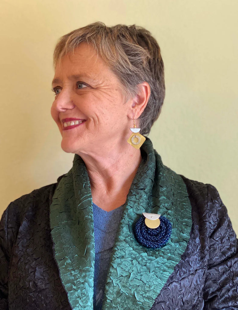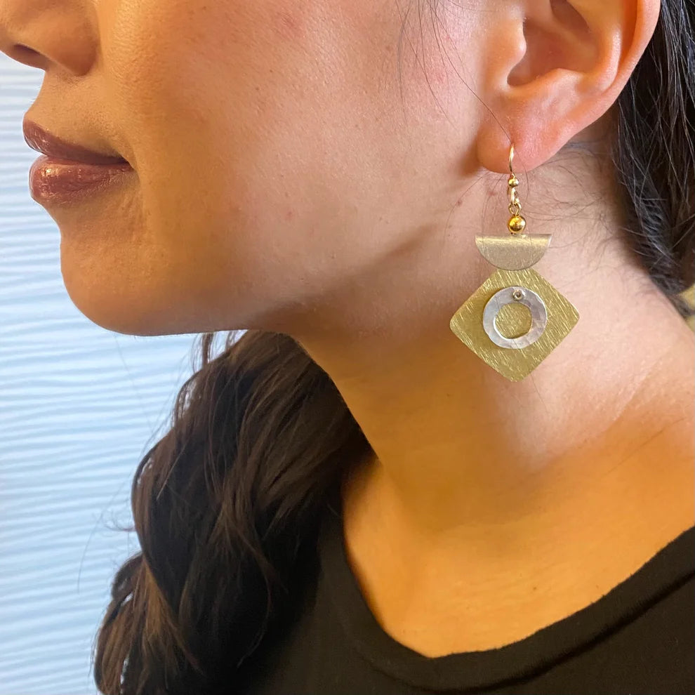Sophisticated and modern angular dangle earrings "Sway" from the Chick Boss Sculptural Collection Hand-cut and textured aluminum and brass Sterling Silver wires Measures approximately 2-3/4L x 1-1/2"