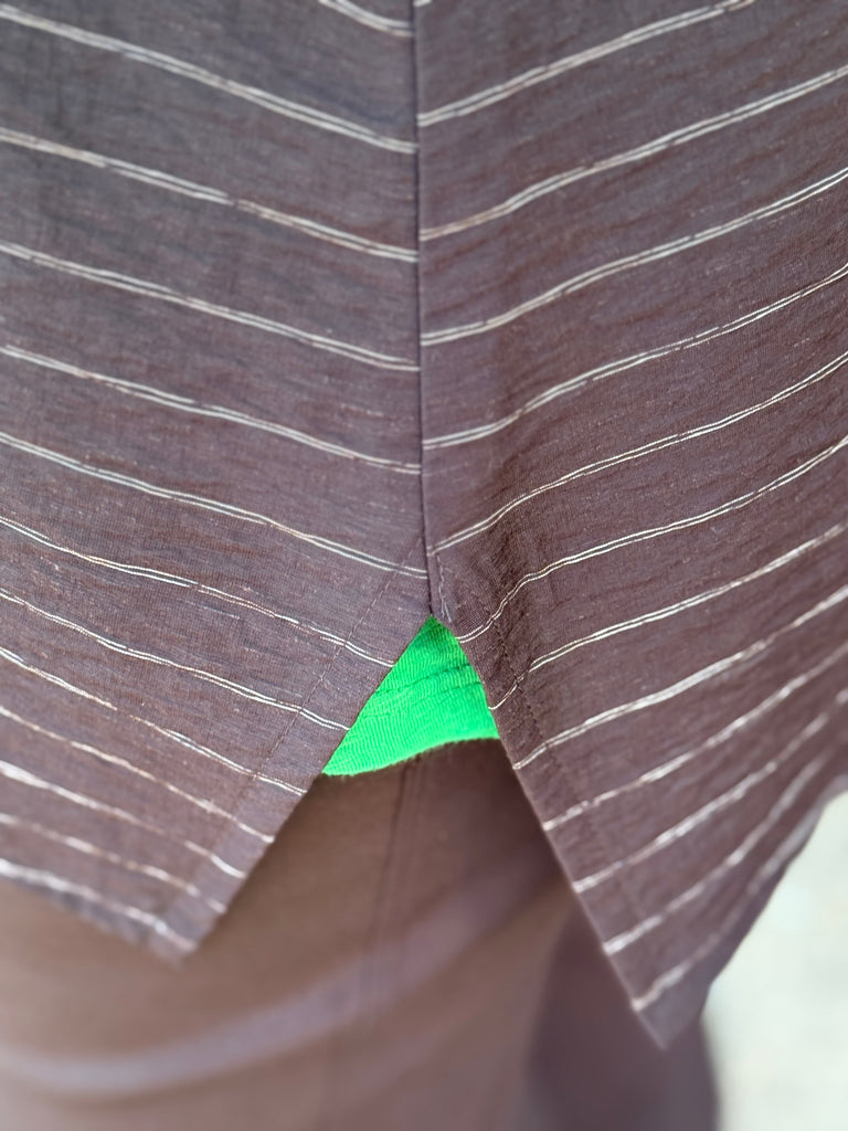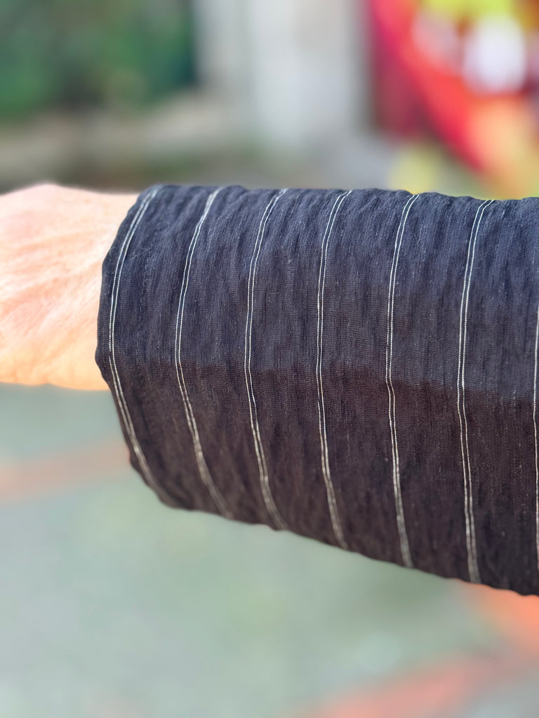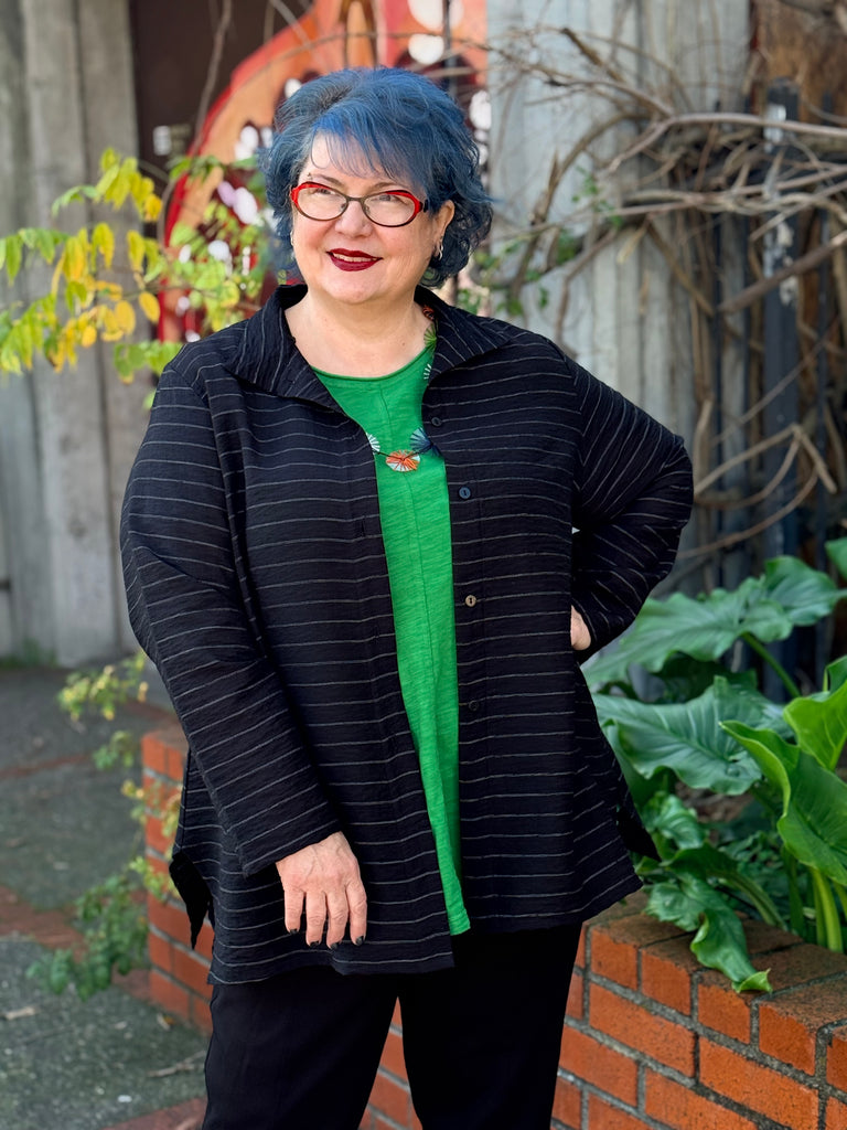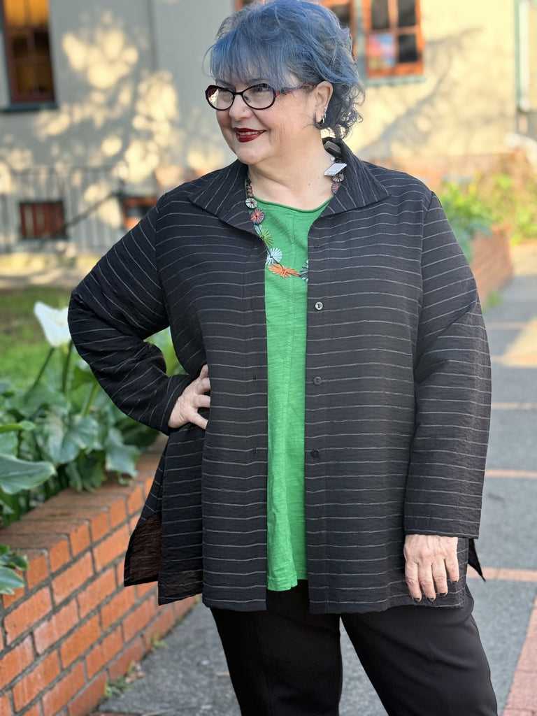 Dress it up for work, pair with denim, wear it as shirt or jacket - the versatile Mandarin Collar Top is a wardrobe workhorse. It has a stand up mandarin collar, a button front, three quarter length sleeves and a curved hemline that drops longer in the middle.ans the seasons. Made in timeless black and white pinstripe, this relaxed knit top has a great a-line shape.
