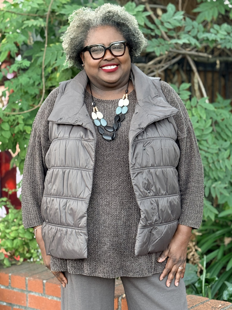 The puffer vest—a seasonal staple with a stand collar and snap button front. In a recycled nylon weave that keeps warmth in—and waste out of landfills.