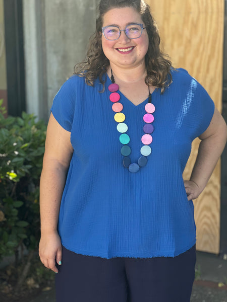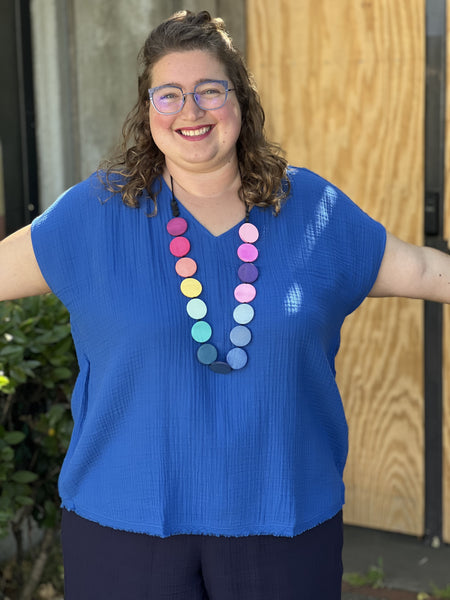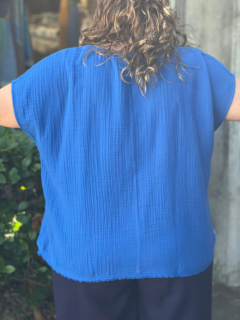 A simple shape set apart by gauzy texture. The V-neck square top with cap sleeves, in our light and lofty organic cotton doubleweave. Made in a Fair Trade Certified™ factory.