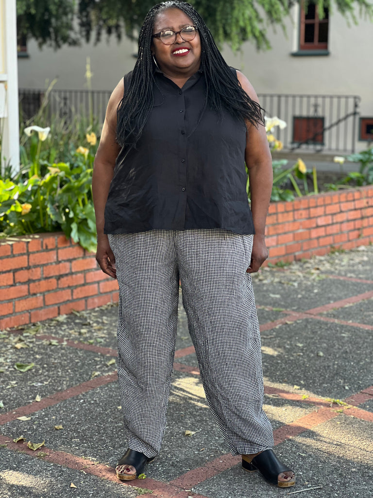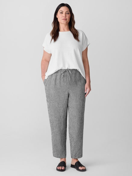 A yarn-dyed check pattern adds intrigue to a relaxed tapered pant. Designed with a drawstring waist and pockets, in breezy organic linen.