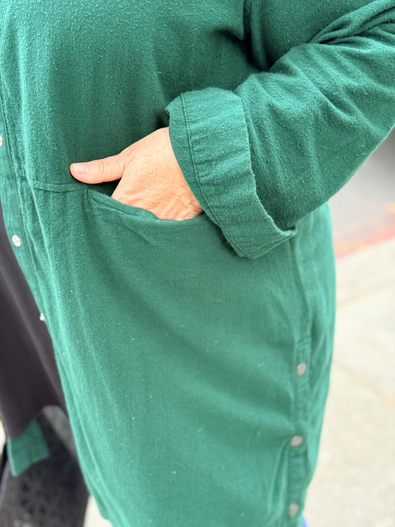 Designed to smooth and lengthen your silhouette, this cozy warm but light flannel Duster can be worn as a tunic over leggings or open as a layering piece. Details include dyed to match tape along the snap close front. It falls just above the knee with roomy front pockets a front seam at the waist, and a trio of snaps on the sides near the hemline.