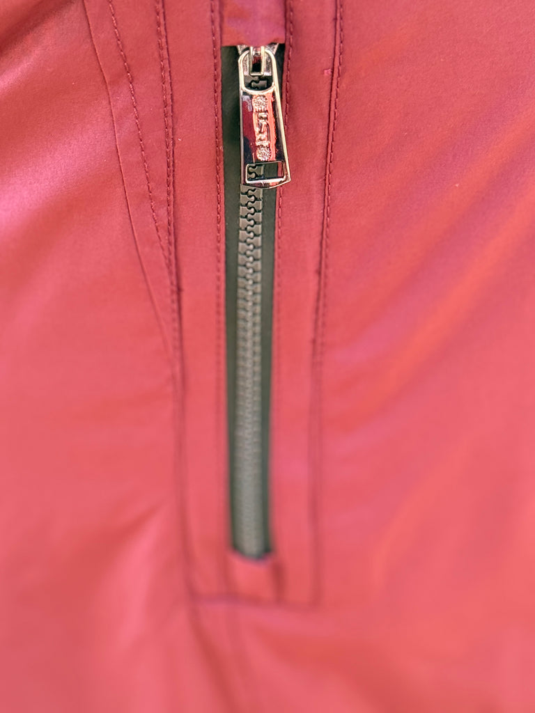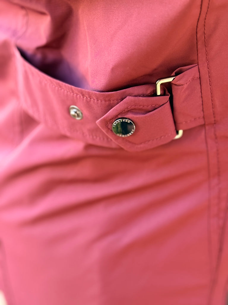Perfect for the cold weather, this fabulous longer length coat by Frandsen comes in a warm Burgundy with a detachable drawstring hood, long sleeves with elasticated inner cuffs, and a front zip fastener under a snap placket. The coat also features a removable inner collar to further keep out drafts, waist adjustment for additional shaping and multiple zipped pockets for keeping those valuables safe. Made from a breathable fabric, rainproof, with taped seams and treated with a water resistant surface to keep you dry.