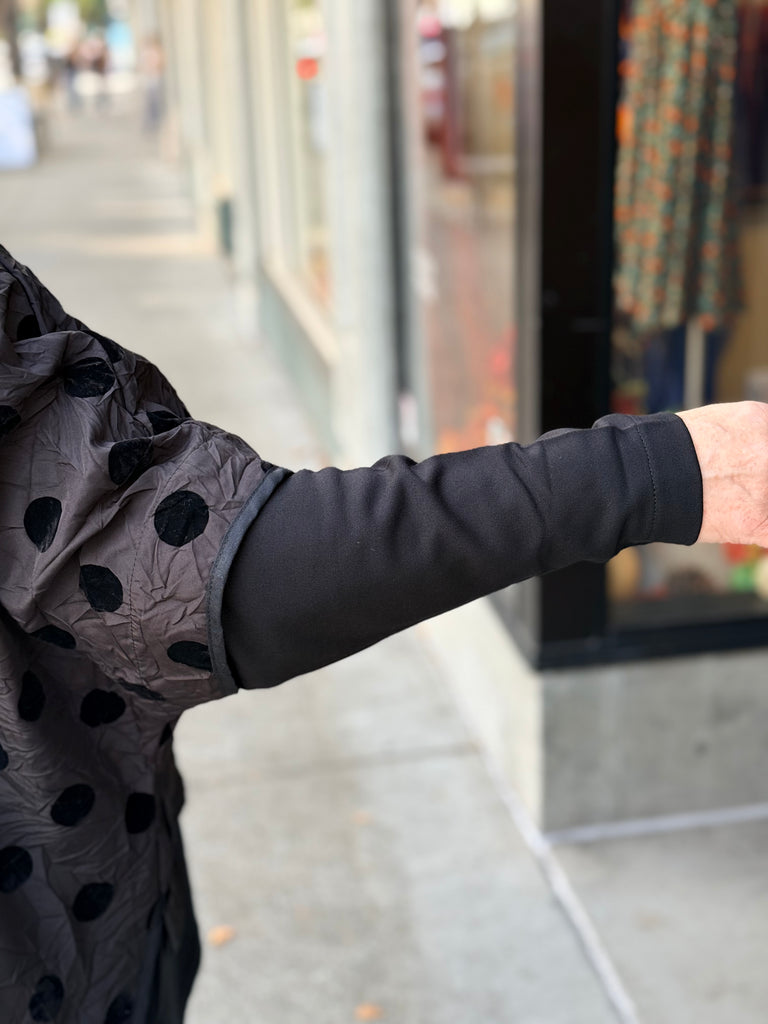 Refresh your look with the Gershon Bram Diva Hoody, a bold layer defined by its crinkled texture and playful flocked dots. The oversisized boxy cut mixes the crinkle dot with a cozy knit sleeves and trim. The generous hood give this piece a modern, easygoing vibe - perfect over leggings.