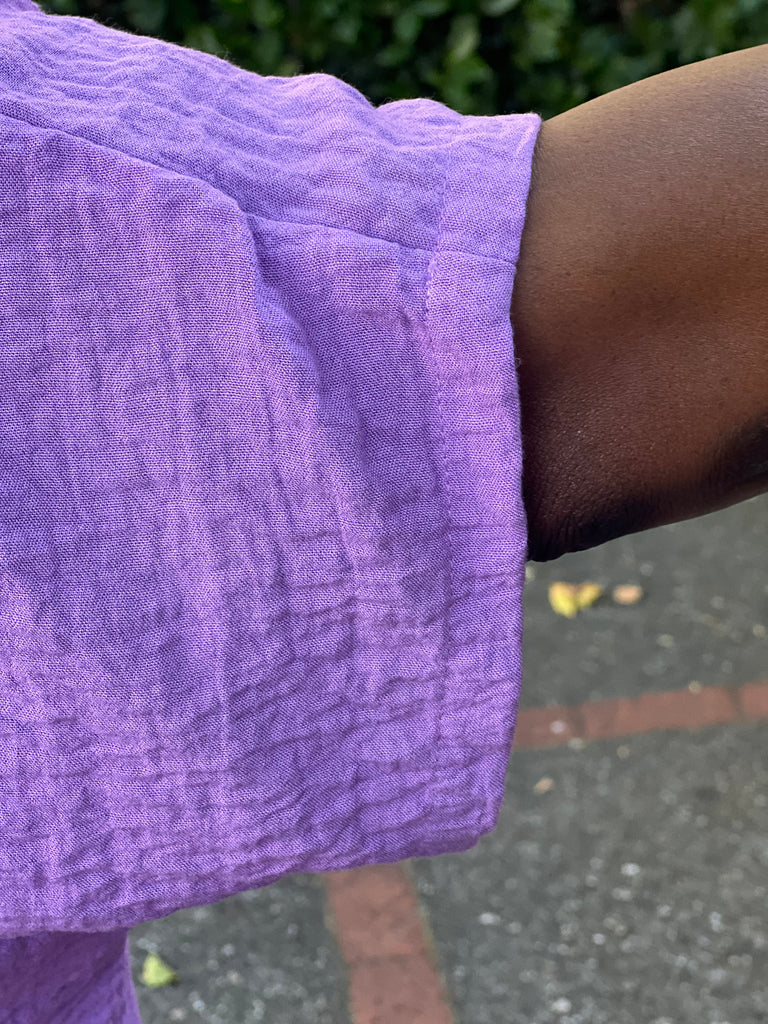 Made here in the USA, this show stopping top has a slouchy layered mock neckline, dropped shoulders, elbow length sleeves and handy on seam side pockets. The unique staggered asymmetrical hemline elevates this artful tunic-length top, creating a stunning fluttering effect with each step you take.