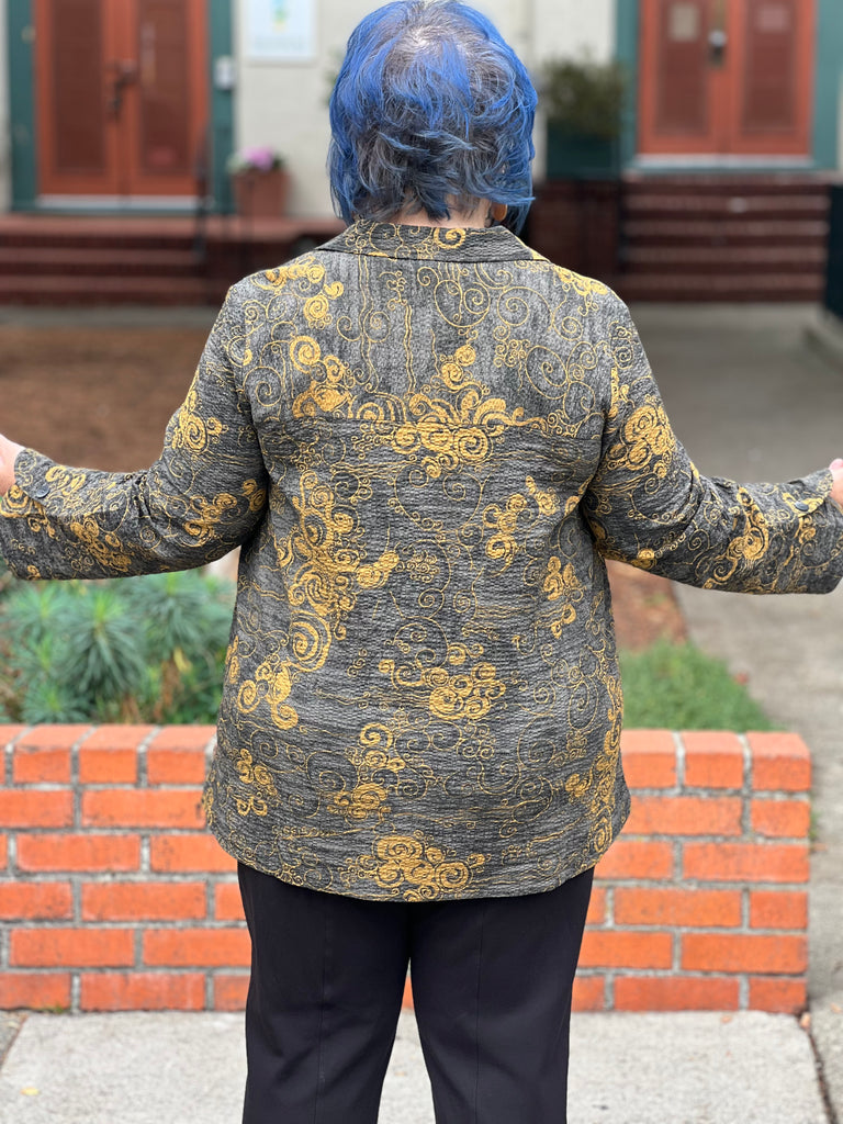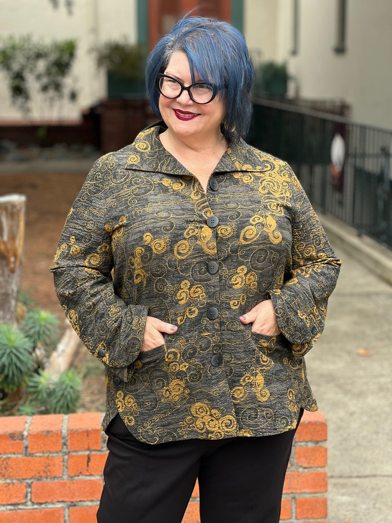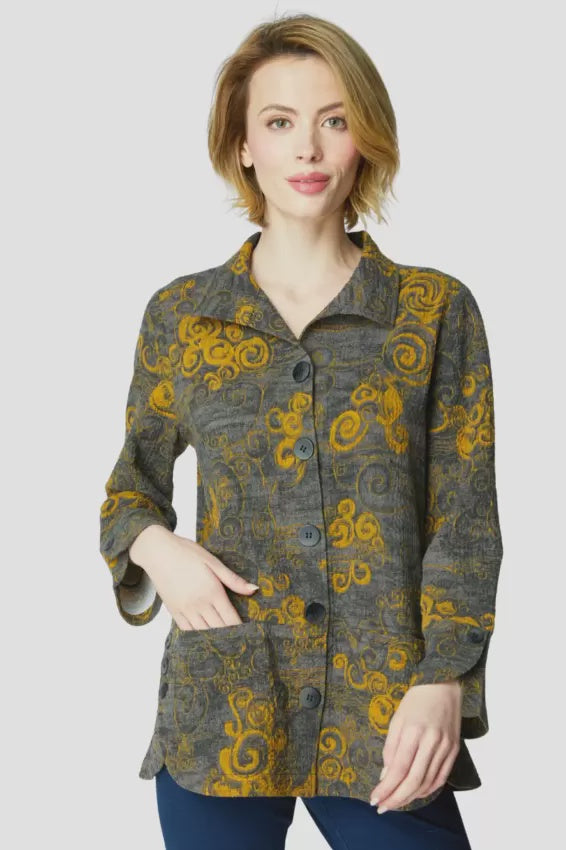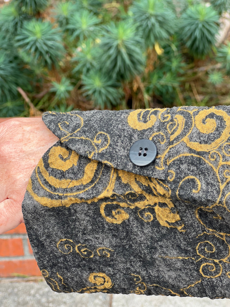 A dramatic new shape in an exclusive antique scroll print. Tulip cuffed sleeves and rounded bottom hem, both with button details. All important pockets