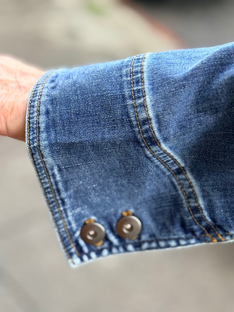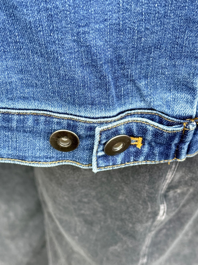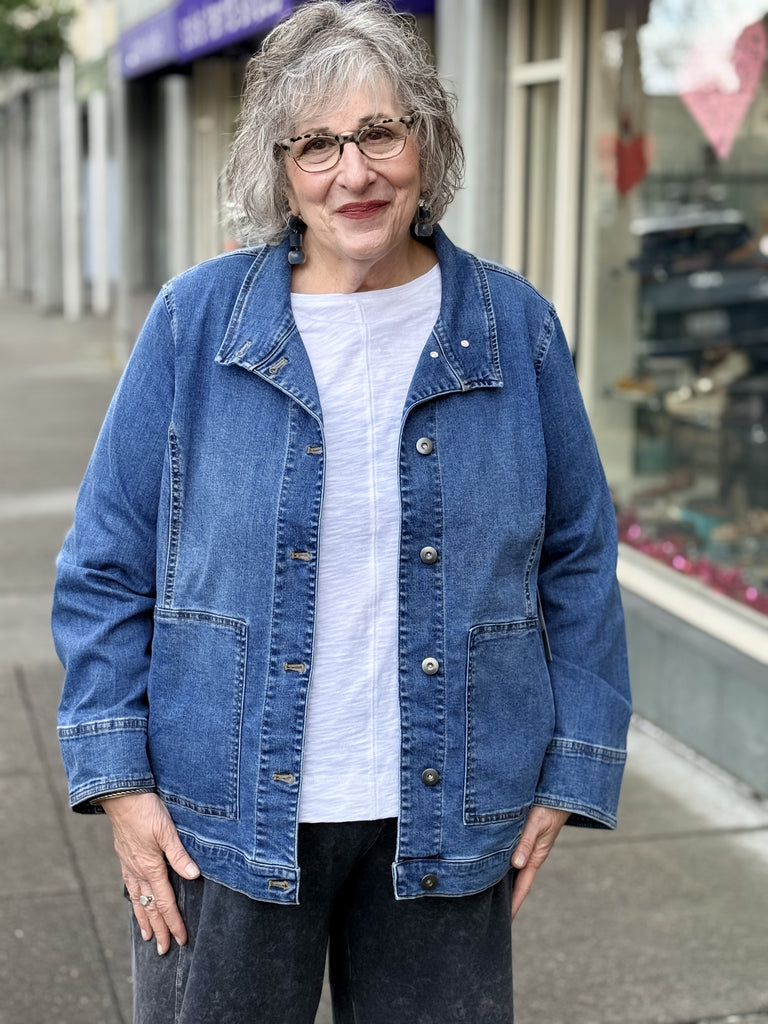 Part jean jacket, part blazer but all very cool. The Adventure denim jacket falls to the hip with metal buttons in front, a short stand-up collar, long sleeves with buttoned cuffs and two deep pockets. With aged to perfection softness, it will look great from this season to the next.
