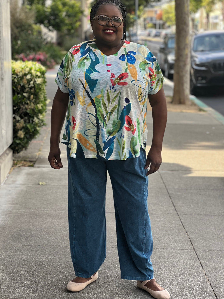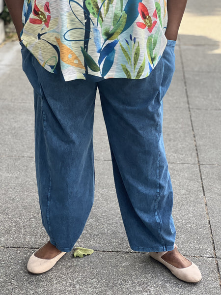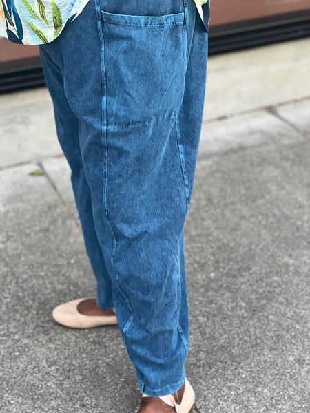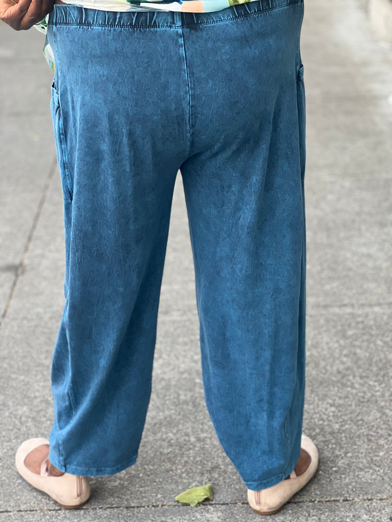 An awesome new design in pants has arrived. These pants are mineral washed for a worn look that matches the tops. With a full elastic waistline and a lantern cut that tapers to the ankles, they're the perfect bottom for comfort and style.