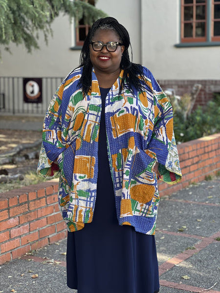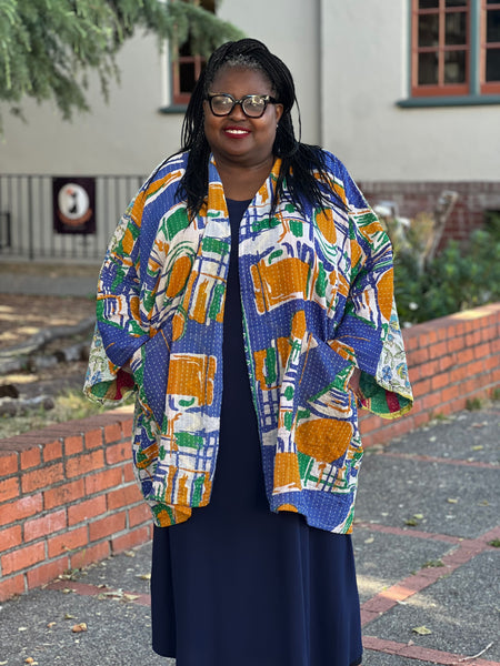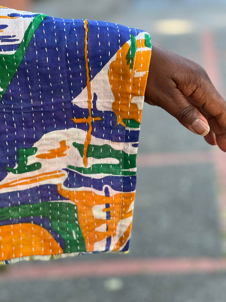 This gorgeous Kantha Kimono has 2 front pockets. The Kantha Stitched fabric is rich and vibrant. A beautifully effortless kimono made from the softest vintage Kantha sari. This design is tunic length and features wide sleeves for added shape.