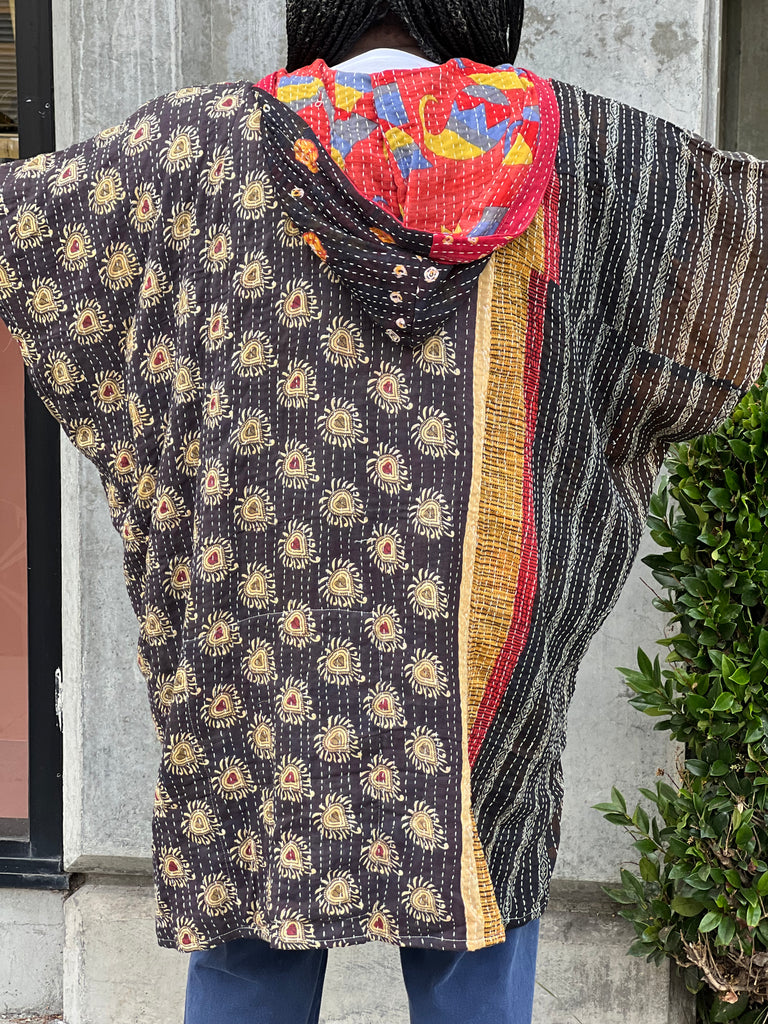 Crafted from pareo kantha stitched cotton sari this dream peace features a hood, two buttons, two slouchy big pockets and side slits for extra dimension. A timeless transitional piece that will transform any outfit into a lux boho moment!