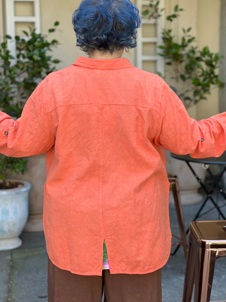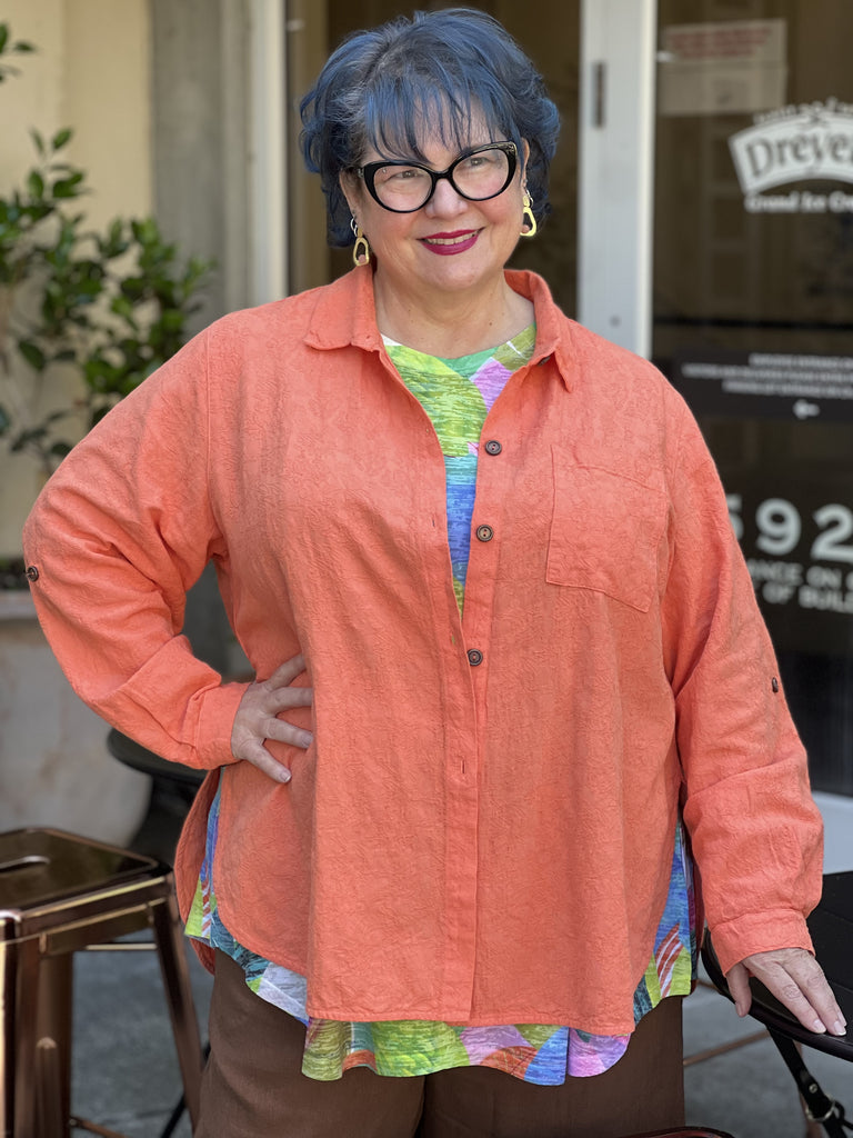 The textured cotton shirt is the made of 100% cotton and matches perfectly over ever-popular Kleen tees. Classically styled with a button front, pointed collar and cuffed sleeve. Two deep splits in the front give a sassy swing to the longer length curved hemline of this summer essential top.