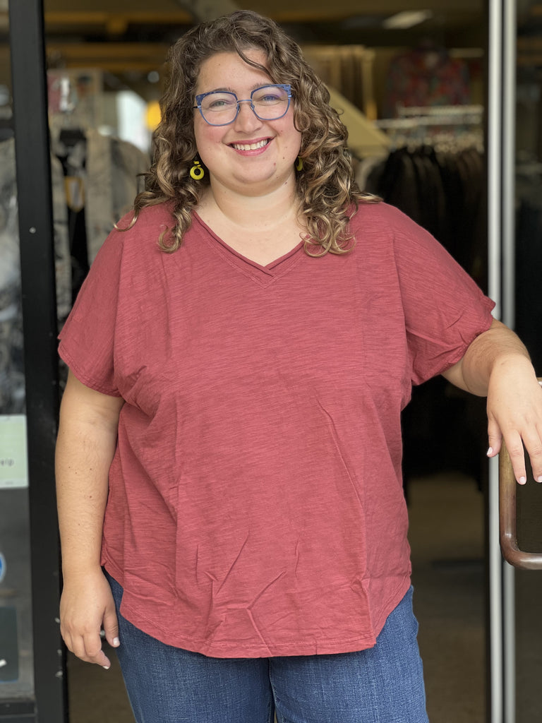 Our favorite oversized rolled-hem V neck tee is back. No inset sleeve, this is a great easy tee for warmer temps.