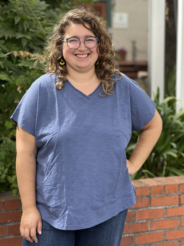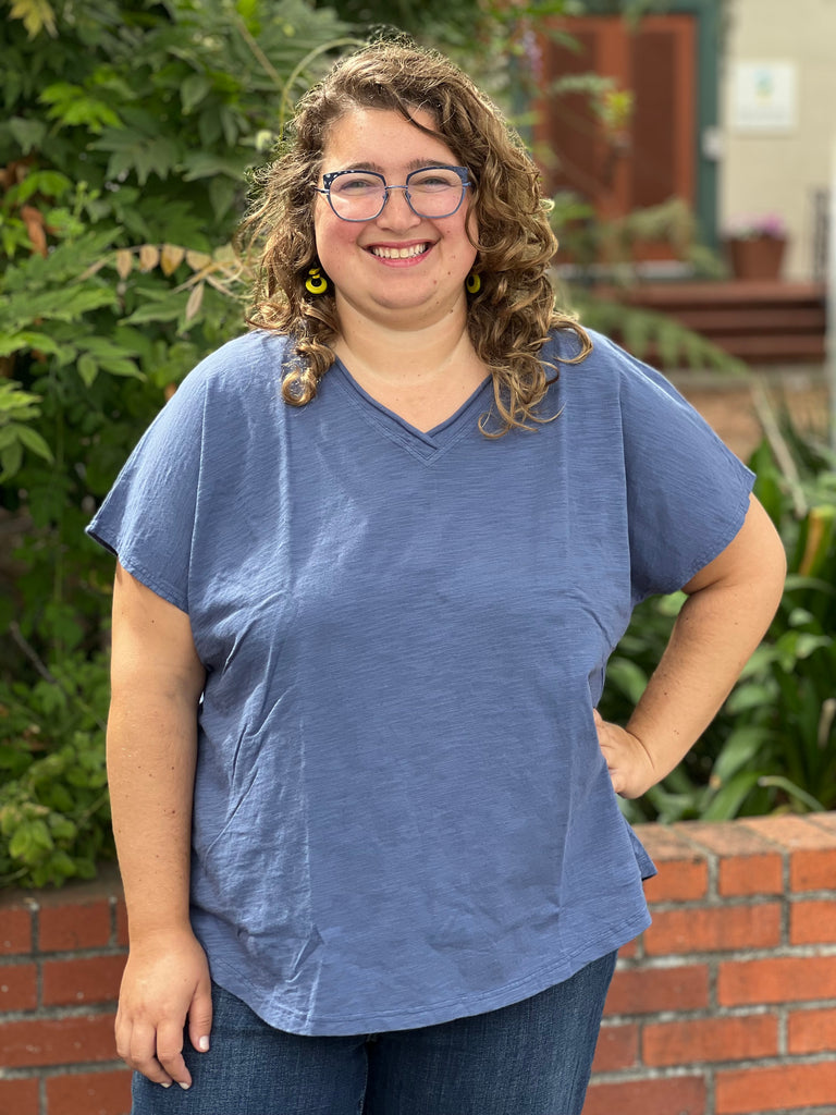 Our favorite oversized rolled-hem V neck tee is back. No inset sleeve, this is a great easy tee for warmer temps.