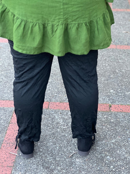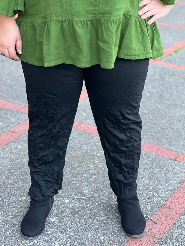 The Carly Pant is a stylish crinkled pant with an easy pull on elastic waistband.  A narrow leg line and a cropped length make this the perfect summer pant for travels near and far.