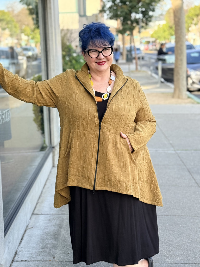 The Kozan Jane Jacket brings sophistication to the next level with edgy texture and a dynamic silhouette. This beloved Zip front Kozan Jacket features a zip front, 2 large front pockets and a slight hi-lo hemline. The textured knit adds a sophisticated twist.
