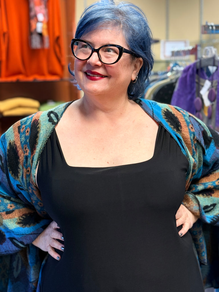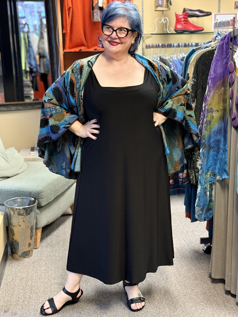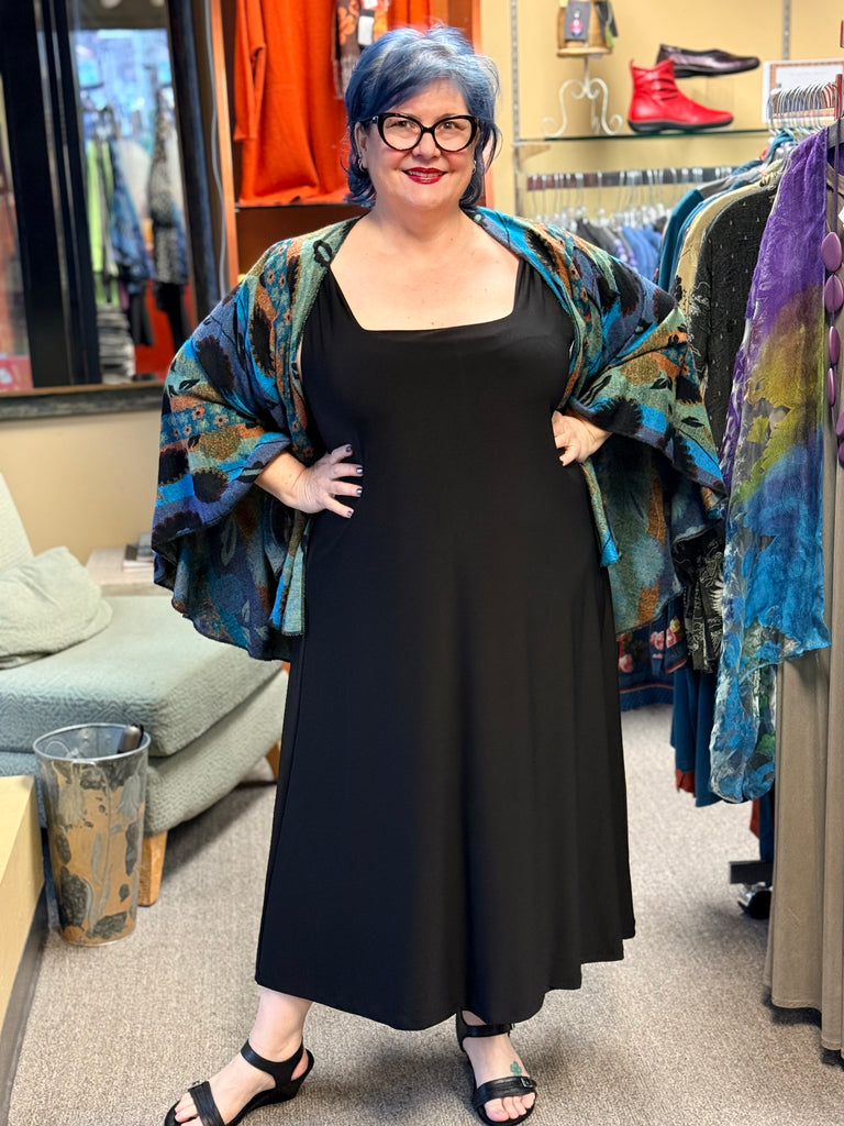 Special Occasion dressing doesn't get any easier than the Tenerif Dress. A sleeveless jersey dress with a silky feel, a soft square neckline and a mid calf length. Darling solo, or layered under a jacket, this mid-calf dress has a soft A-line swing.