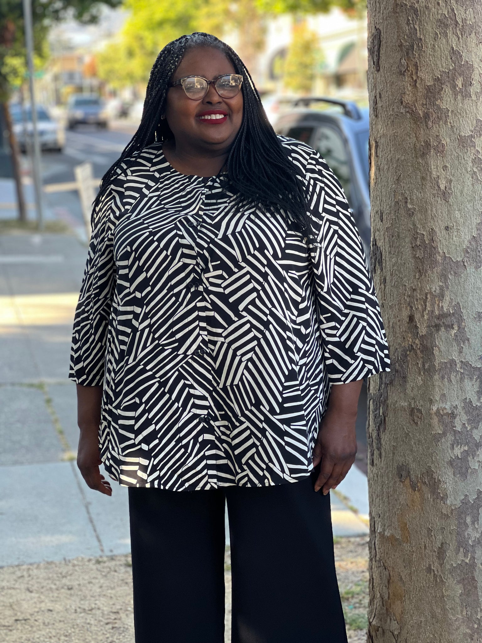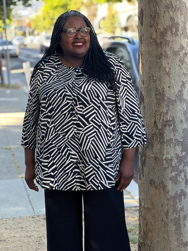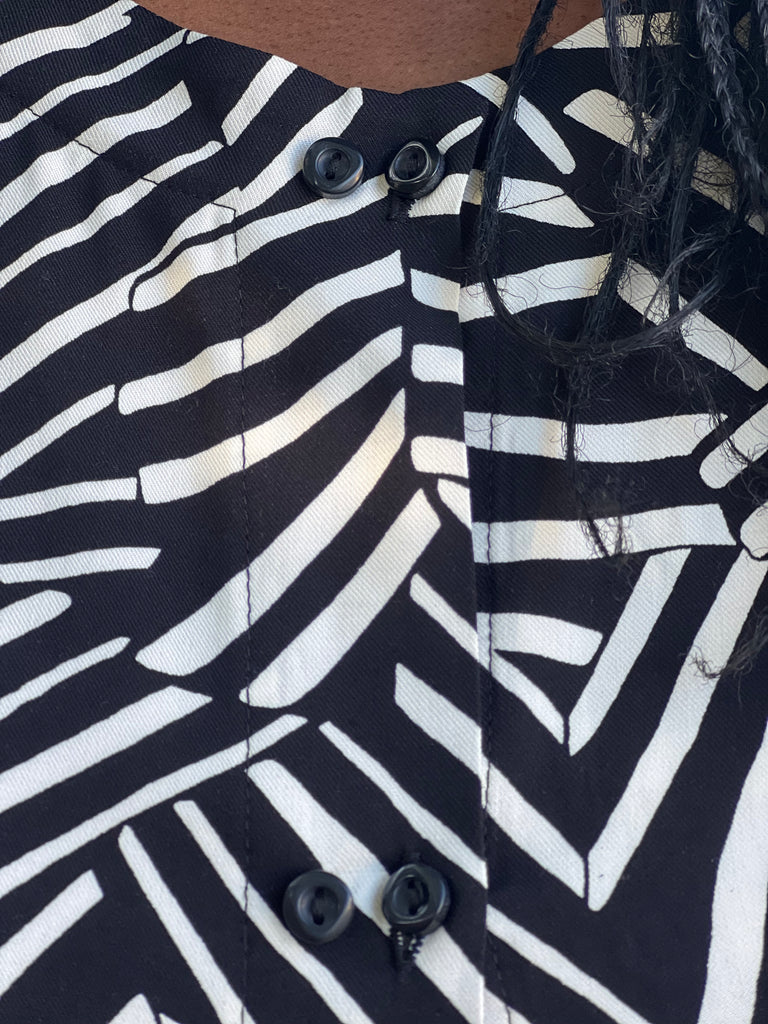 Crafted with a rounded hem and elbow length sleeves, the Cosmos Blouse - is the perfect addition to any wardrobe. Featuring a double set of buttons and a yoke with back pleat, this blouse offers a sleek and sophisticated look. Its no collar design adds a touch of modern elegance and it perfect to pair with a scarf or necklace.