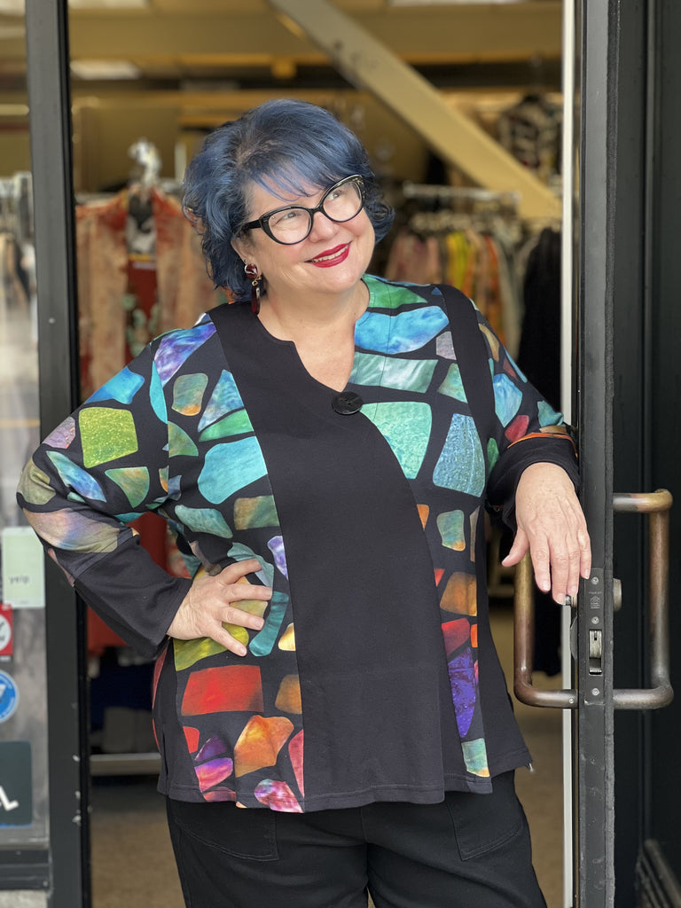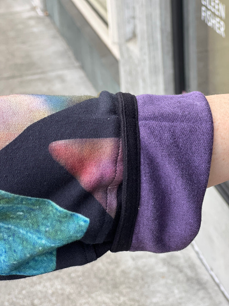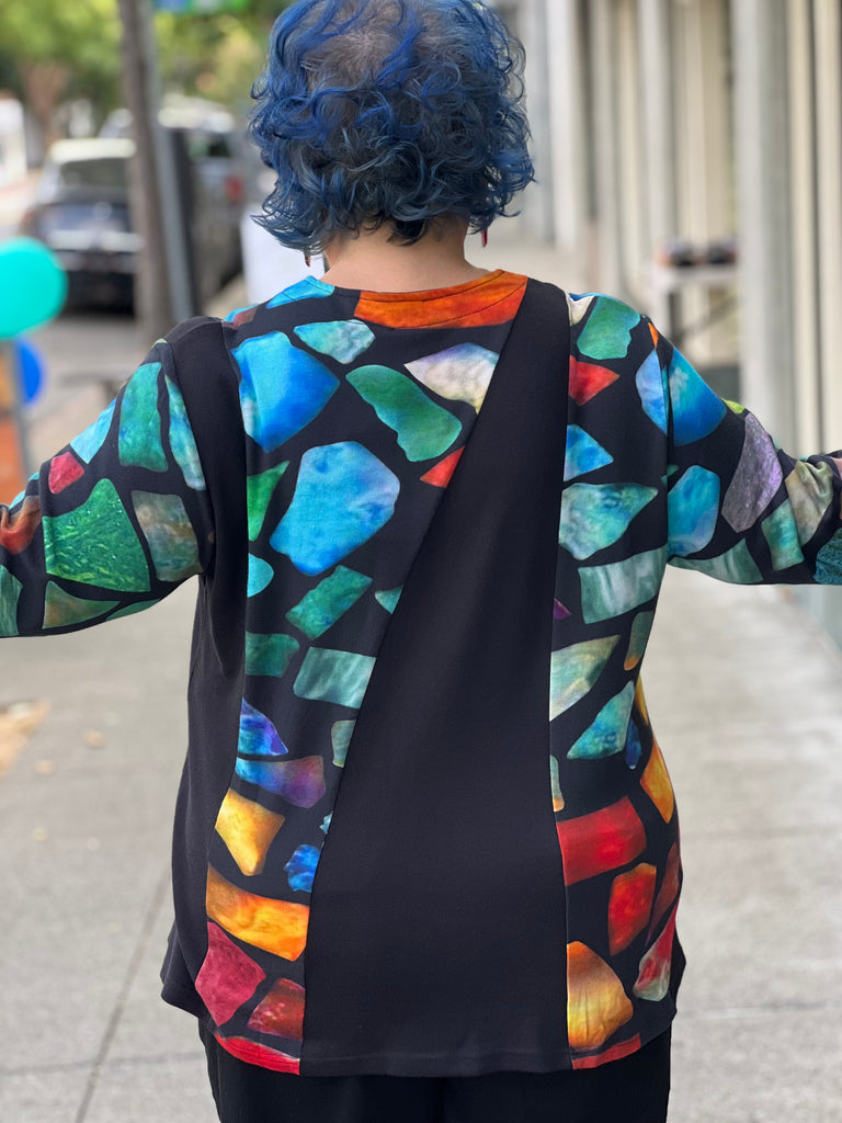 This soft knit top with the perfect amount of stretch can be dressed up with black pants or down with jeans. It features a novelty button just below the soft v-neckline, three quarter length sleeves and a subtle swing through the hemline. Areas of solid black perfectly complement the vivid paver stone pattern.