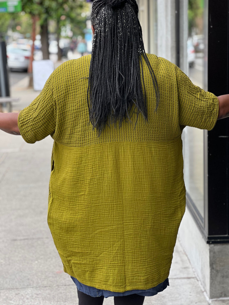 Our Cotton Gauze fabric is made of soft 100% natural cotton fibers that make it breathable, hypoallergenic and light-weight. It is woven using a special technique that involves twisting horizontal warp threads around the vertical weft threads, resulting in a soft, crinkled, and loosely-woven texture with a slight vertical stretch and now we introduce it with a perfect new pin stripe. We focus on having minimal environmental impact by carefully selecting materials like this Cotton Gauze, as it is a wonderful long-lasting material and local to our artisan maker’s.