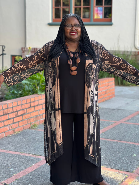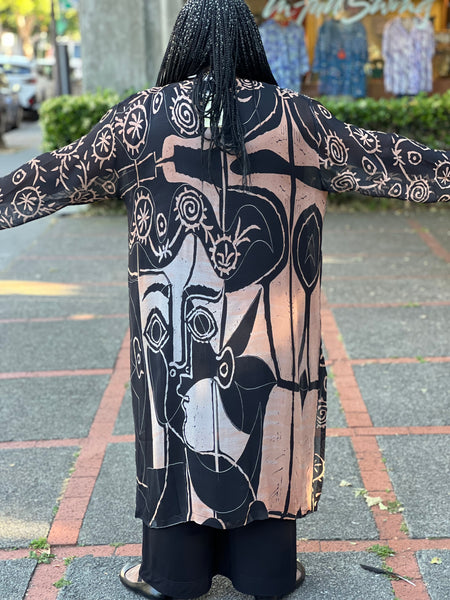 Channel your inner artist with this picasso inspired georgette duster. Perfect over a tank dress or pant and tank, this super lightweight duster packs easy and can be worn casually or perfect for a night out.