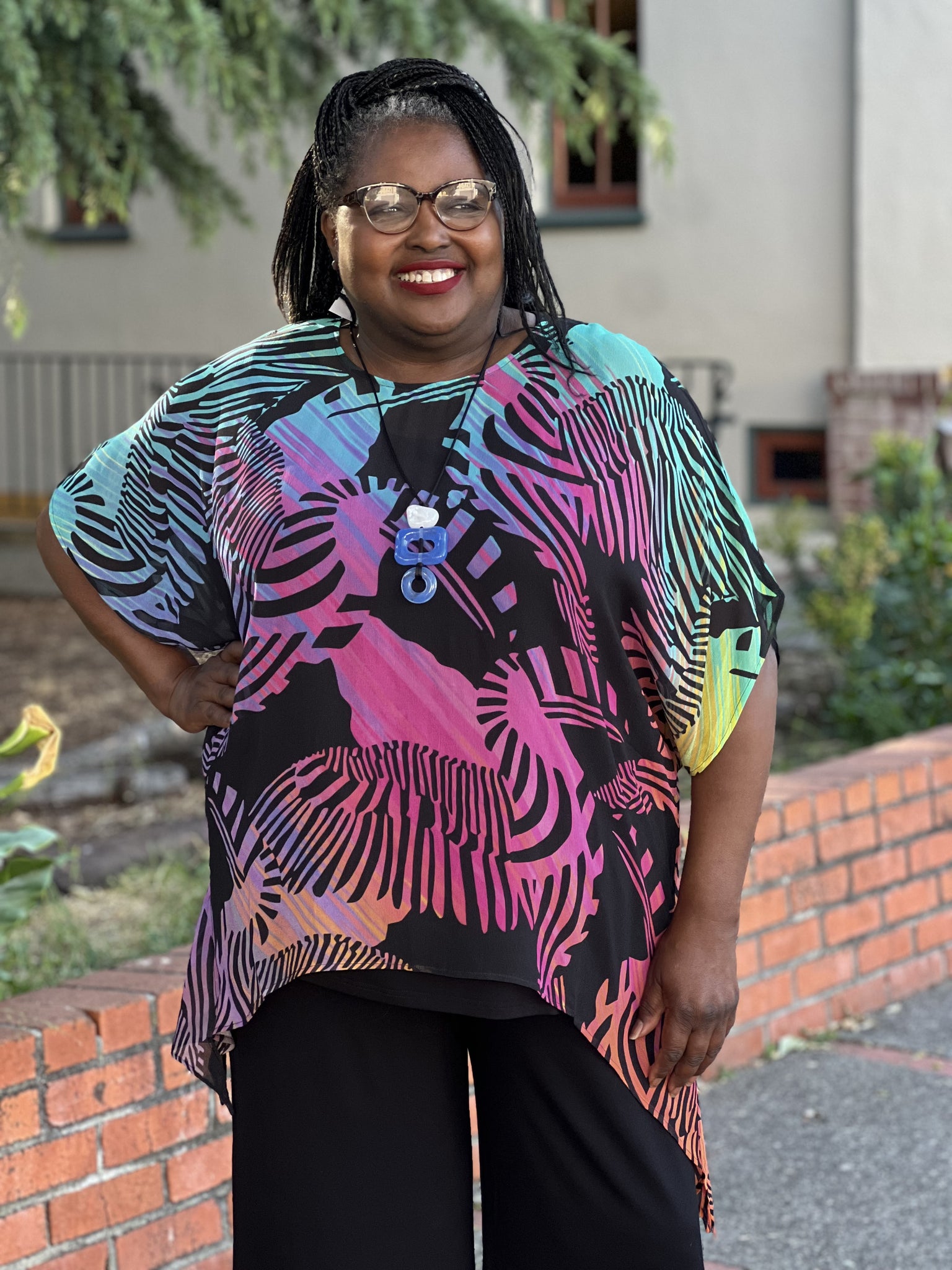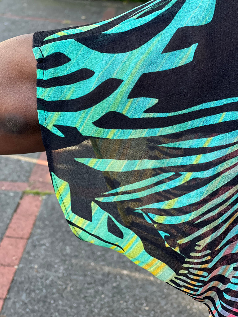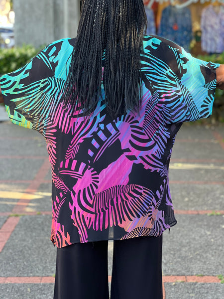 This boxy one-size poncho top features a multi color artistic mask print perfect for any season. Designed in a oversized shape, this topper works beatifully over a tank top or dress.