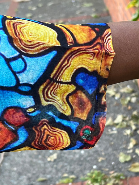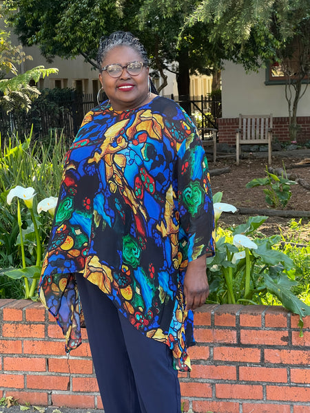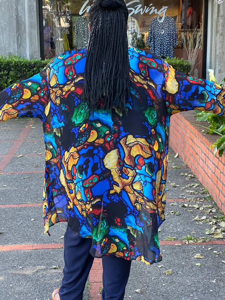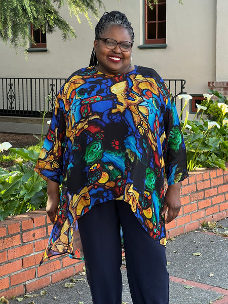 This oversized piece features a beautiful jewel tone print perfect for any season Designed in a oversized shape, the hem is arched in front and curved downward in back in a high/low silhouette.