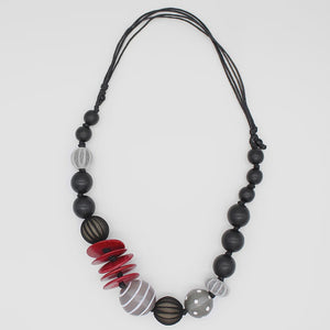 Introducing the Black and Red Mixed Bead Amara Necklace, a statement piece for the bold and artistic. With a mix of polka dot, striped and artfully wrapped beads, accented by vibrant red beads, this adjustable wax cord necklace is expertly crafted for a unique and eye-catching look. Make a statement with every wear!