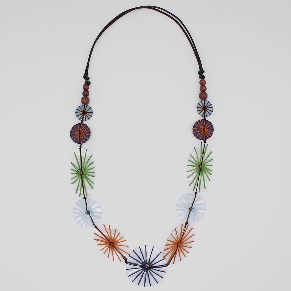 This fun necklace will be your new go-to necklace. This distinctive piece features soft clear beads each intricately wrapped with vibrant color threads to create a textured and visually appealing design. The combination of smooth wood and delicate thread work adds a unique touch to this versatile necklace, making it a standout accessory for any occasion.