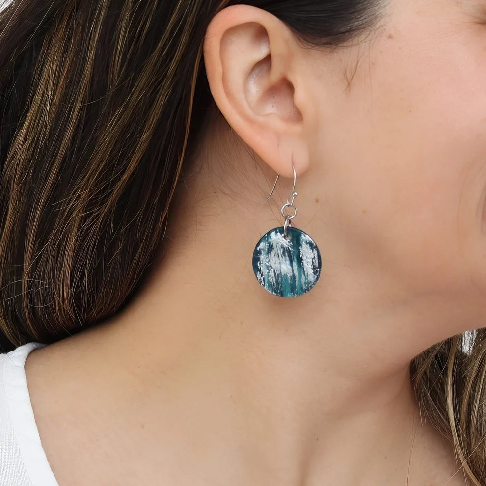 Indulge in the timeless beauty of our Ocean Blues Maren Earrings. Hand painted with silver accents, these round disc earrings feature a striking ocean blue color that evokes the beauty of the sea. With a delicate dangle and artistic design, these earrings are the perfect addition to any outfit, allowing you to channel an effortless elegance and sophistication.