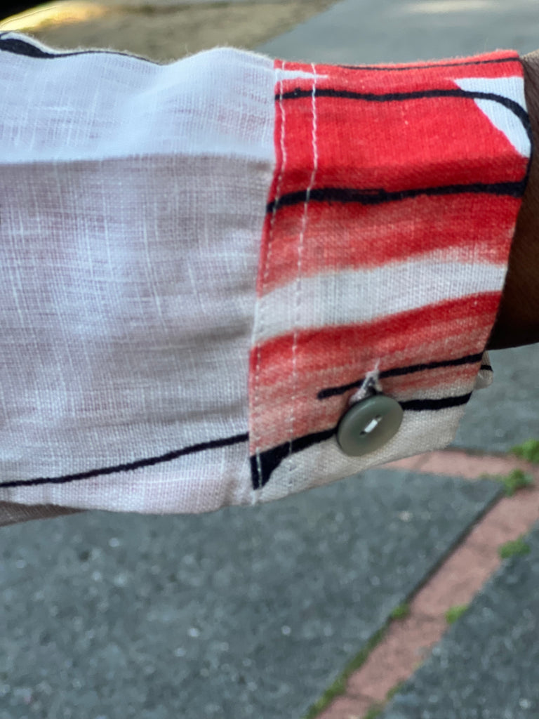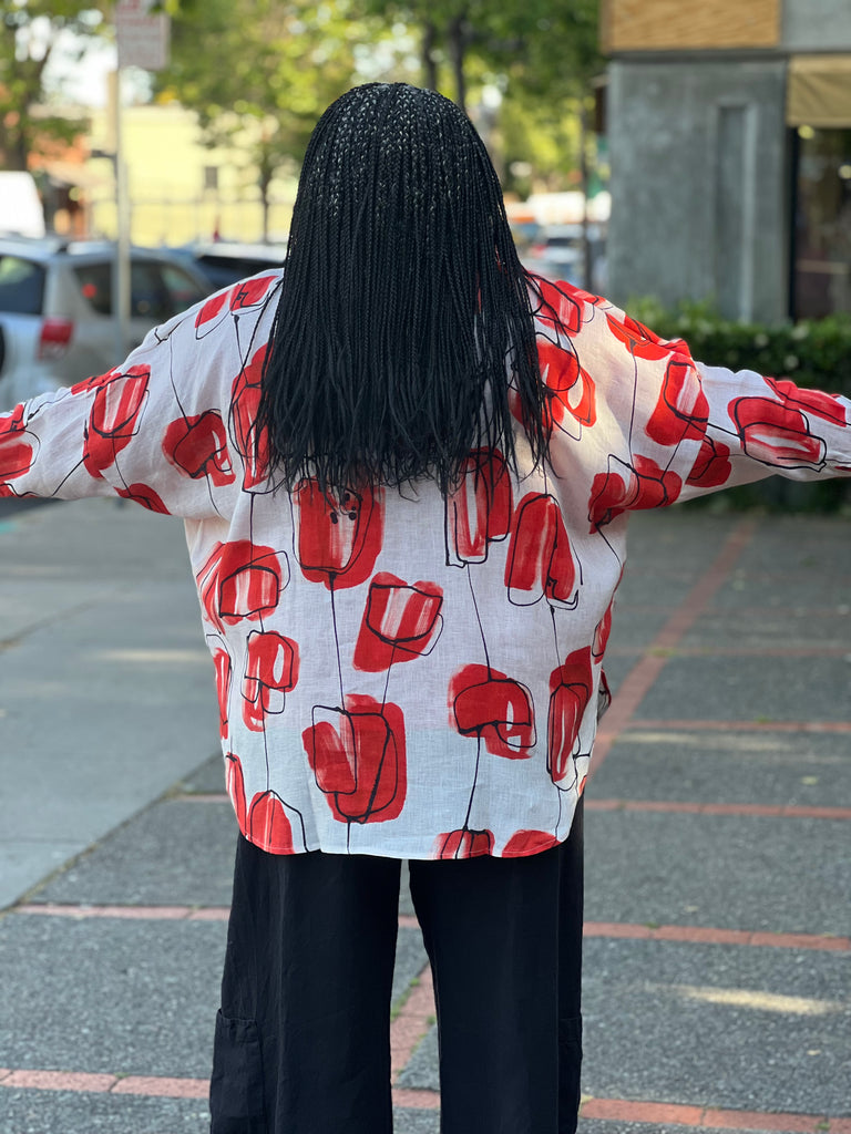 The relaxed, boxy silhouette drapes beautifully with wide sleeves and a softly structured collar. Polished shell buttons add a refined touch, while the vivid print brings a painterly elegance to everyday dressing.