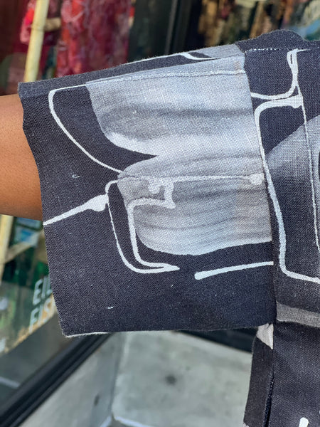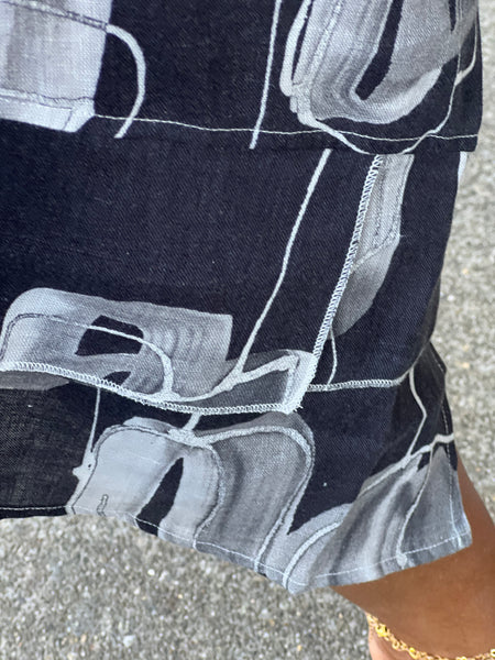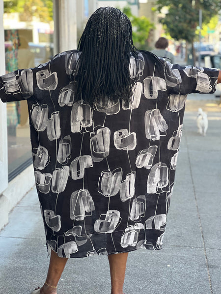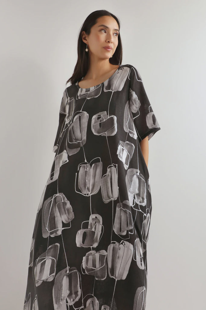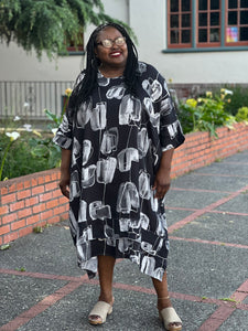 The shape is roomy and swingy, with a generous scoop neckline and short sleeves. The subtle side pockets (yes, it has them) and softly flared hem make it a joy to wear, and the bold, abstract print does all the styling for you. Just add sandals and you're set.