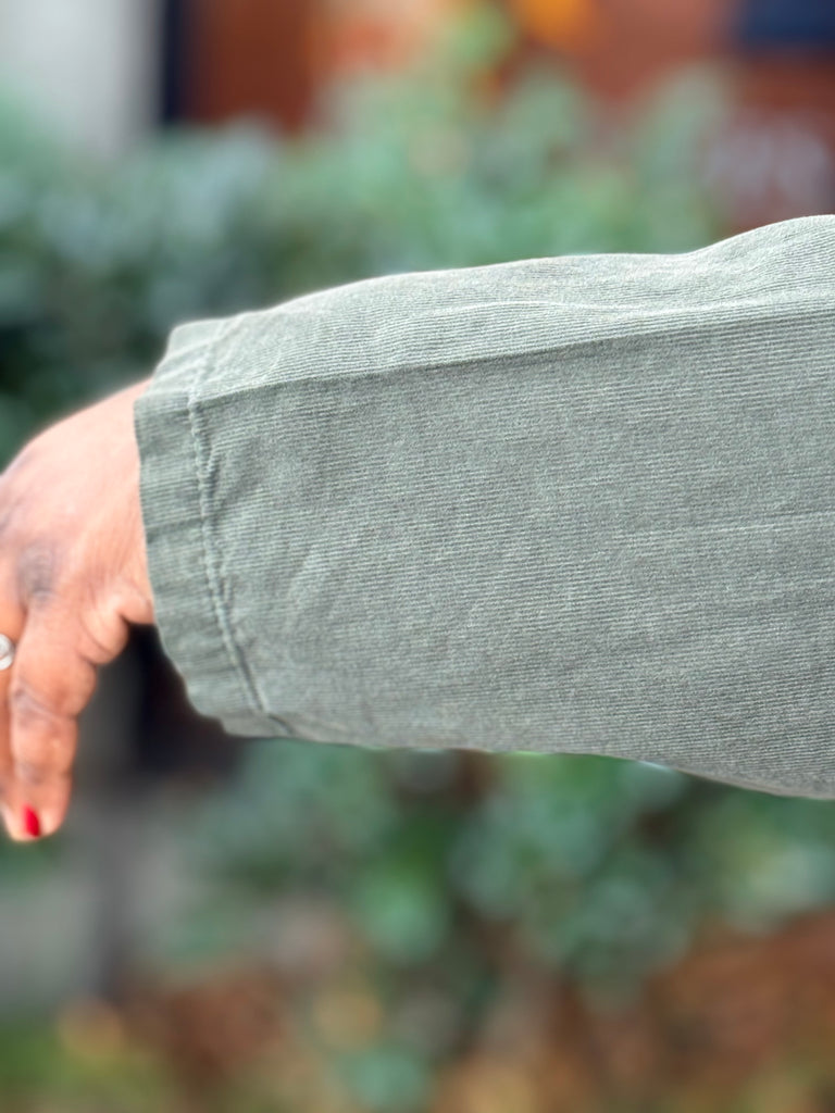 Elevate your wardrobe with the all Cotton Pinwale Corduroy Pocket Dress in gorgeous olive. Crafted in Italy from luxuriously soft cotton corduroy, this versatile one-size dress is the epitome of effortless style and comfort. Its relaxed cocoon shape flatters all body types, while the charming bow-accented pockets add a playful touch of personality.