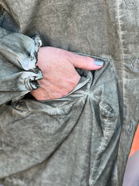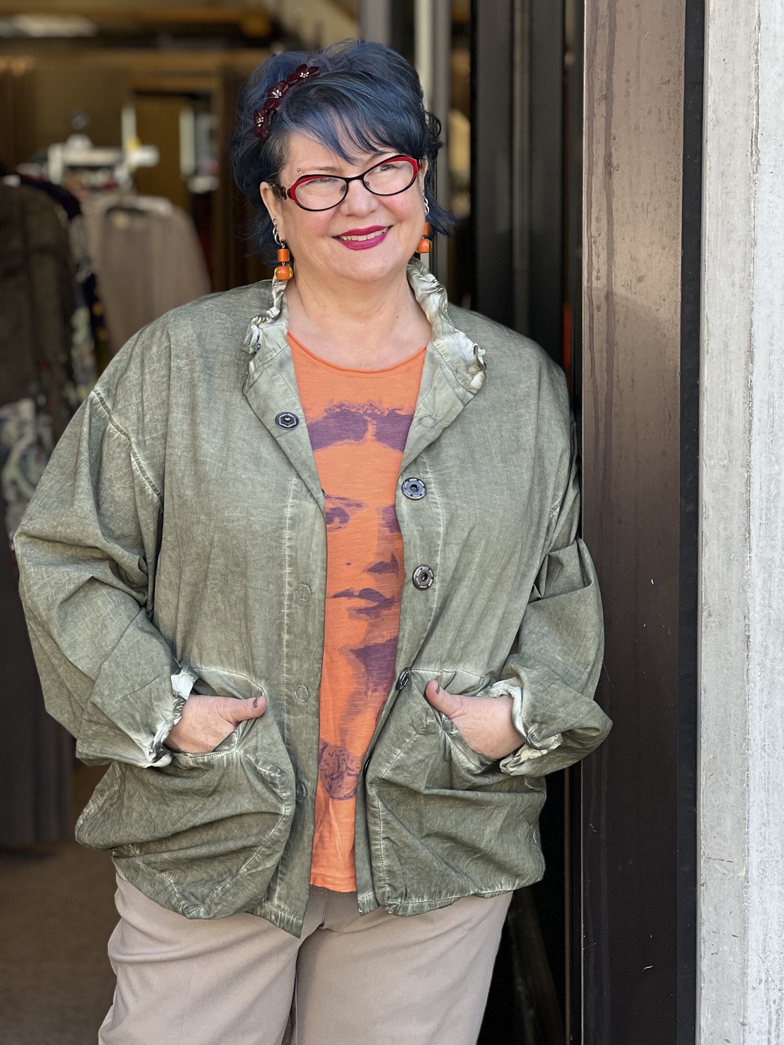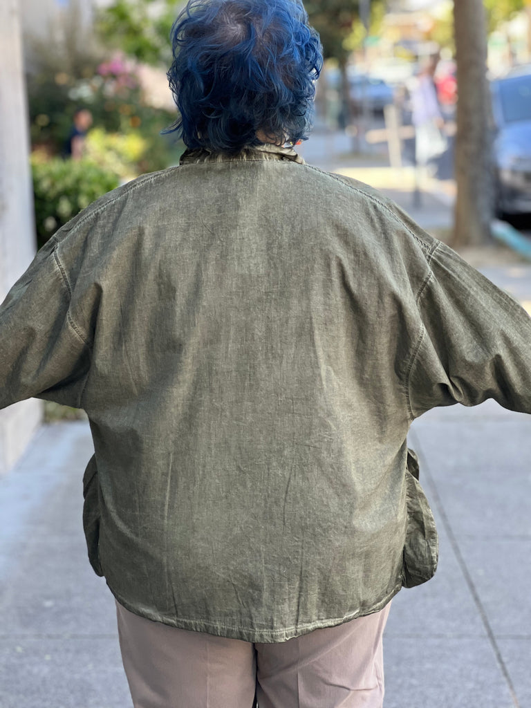 A fantastic easy style jacket from Zilberman, designed to be worn oversized. This jacket is unstructured with a generous relaxed silhouette and bubble shaping. This unique jacket is crafted from a woven cotton farbic which is super comfortable to wear. Featuring a decidedly urban aesthetic with a relaxed boxy shape with clever wired edge seams for creative shaping options. Also a great style for transitional wear.